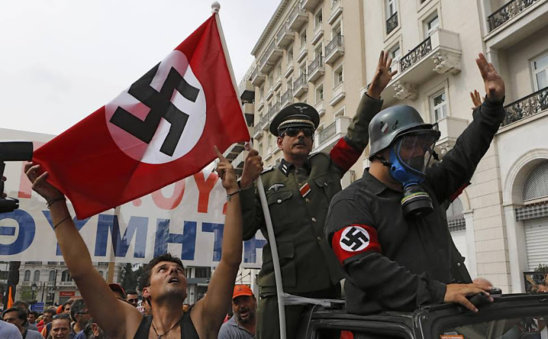 Alguns manifestantes não hesitaram em hastear uma bandeira nazi e em comparar a Alemanha de Angela Merkel a um IV Reich.